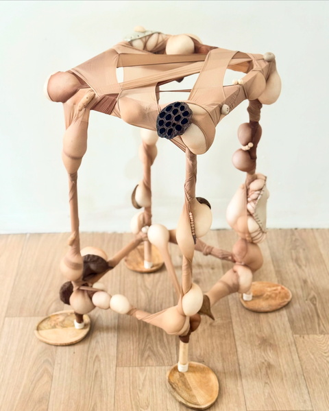 A kind of ecosystem emerges, where amorphous forms settle, unfold, and follow their own logic, engaging in interaction. The work grows like an organism during its creation, exploring boundaries, tension, softness, and hardness.